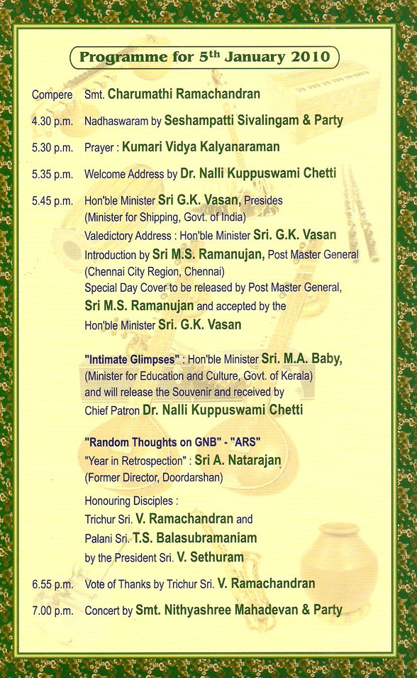 ஜனவரி நாலாம் தேதியும், ஐந்தாம் தேதியும், ஜி.என்.பி-யின் நூற்றாண்டு விழா இந்தியன் ஃபைன் ஆர்ட்ஸில், நடை பெறவுள்ளது. முதல் நாளில் ஜி.என்.பி-யைப் பற்றிய ஆவணப் படம் வெளியாகிறது. மூன்று வருடங்களுக்கு முன் நான் எழுதிய ‘இசையுலக இளவரசர் ஜி.என்.பி’ என்ற புத்தகம், இந்தப் படத்துக்கான script-ஆக அமைந்துள்ளது. எந்தெந்தப் பகுதியை யாரை வைத்துப் பேச வைக்கலாம், எந்தெந்த விஷயங்கள் கண்டிப்பாக இடம் பெற வேண்டும், பல நூறு மணி நேர ஒலிப்பதிவுகளிலிருந்து, எந்தெந்த ஒலிப்பதிவுகளை, எவ்வளவு கால அளவுக்குச் சேர்க்க வேண்டும் என்றெல்லாம் மண்டையை உடைத்துக் கொண்டோம். இவை தவிர, ஜி.என்.பி-யின் biographer என்ற வகையில் நானும் இந்தப் படத்தில் பேசியுள்ளேன். ![]() ![]() ![]() சாதாரணமாய் பல மணி நேரம் ஜி.என்.பி-யைப் பற்றி வாய் ஓயாமல் பேசக் கூடியவன், என்ற போதும், கேமிரா முன் பேசுவது அத்தனை சுலபமாக இல்லை. நின்று கொண்டு பேசினால், “சார், இது ஃபோட்டோ இல்லை. சாதாரணமாய் இருங்க, இவ்வளவு விரைப்பு வேண்டாம்”, என்றனர். சரி இப்படிச் சொல்லிவிட்டார்களே, கொஞ்சம் நடந்தவாறு பேசினால், “சார்! ஃப்ரேமை விட்டு, ரொம்ப போறீங்க. கேமிராவைப் பார்த்து பேசுங்க. முகத்துல வேர்வை ரொம்ப இருக்கு (அசடு வழுவதைத்தான் சூசகமாகச் சொன்னார் போலும்)!”, என்றெல்லாம் சத்தாய்ப்புக்கு மத்தியில் பேச்சு எப்படி வரும். இரண்டு ஷாட்டுக்கு நடுவில் எதையேனும் சொன்னால், “சார்! இதை அப்டியே கேமிரா முன்னாடி சொல்லுங்க”, என்றார் இயக்குனர். அதை கேமிரா முன் சொல்லும் போது, முன்பு வந்த கோவையான மொழி மறுபடியும் வரமாட்டேன் என்று அழிச்சாட்டியம் பண்ணியது. 15 நிமிடப் பேச்சுக்கு, ஒன்றரை மணி நேரம் ஷூட்டிங். இயக்குனர் காந்தன்தான் பாவம். நாம் எவ்வளவு உளறினாலும், “ரொம்ப நல்லா பேசினீங்க”, என்றார். சென்ற வாரம், ப்ரிவ்யூ பார்த்து, சிற்சில இடங்களை மாற்றியமைத்தால் இன்னும் நன்றாக இருக்கும் என்று கூறினேன். படம் எப்படி வந்திருக்கிறது என்று நான் சொல்லப் போவதில்லை. நாலாம் தேதி மாலை, வந்து பார்த்துவிட்டு, நீங்கள் சொல்லுங்களேன்! ஜி.என்.பி நூற்றாண்டு மலர் வேலை, நான் எதிர்பாராமல் வந்த ஒன்று. யார் யாரோ செய்யப் போகிறார்கள் என்ற செய்தி, கடந்த ஒரு வருடமாகவே என் காதுகளில் விழுந்து கொண்டிருந்தன. ஆகஸ்ட் மாதம், ஜி.என்.பி-யின் பேரன் மகேஷ் தொலை பேசினார். “வழக்கமாய் வரும் souvenir-களில் விளம்பரங்களுக்கு இடையில், சில கட்டுரைகள் இருக்கும். அந்தக் கட்டுரைகளும், “ஜி.என்.பி பெல்லாரியில் உப்புமா சாப்பிட்டார்”, “மல் வேஷ்டியை மன்னார்குடியில் வாங்குவார்”, போன்ற செய்திகளும், சிரிப்பே வராத ஜோக்குகளும் நிறைந்திருக்கும். அப்படி இல்லாமல், ஜி.என்.பி என்ற கலைஞரின் கலையைப் பற்றி முழுமையான 